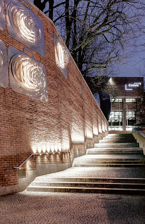 For the numerous stairways the LED PUCK system, which was specifically developed for flush integration into metal handrails, ensures safety-focused illumination of the stairs. Furthermore, the small yet efficient light sources (1.6 W), which have a service life of some 50,000 hours, provide atmospheric lighting for the neighbouring masonry with warm white light of 3,000 Kelvin.