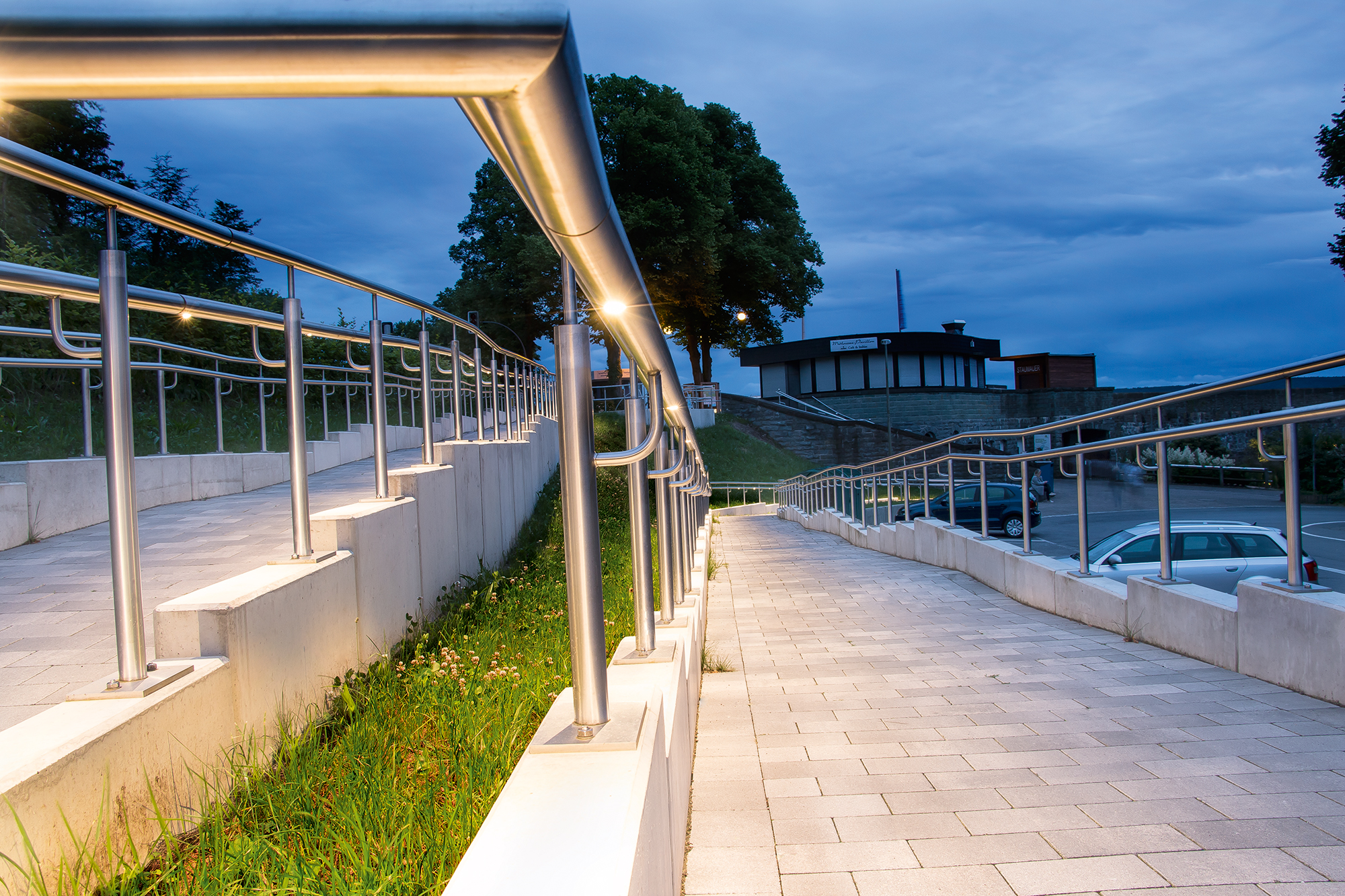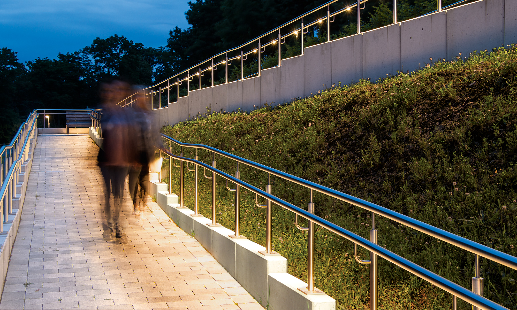 Thanks to the integration in a second discreet aluminum handrail, which is in front of the historical one, the light source is not perceived. In terms of lighting design the system also offers added value: illumination can be optimised even further by the offset between and the beam angle of the light sources. Thanks to flexible, individual arrays, the LED lighting system can be used both in straight and curved arrays, which was particularly necessary given the small radii at the Halle court building.