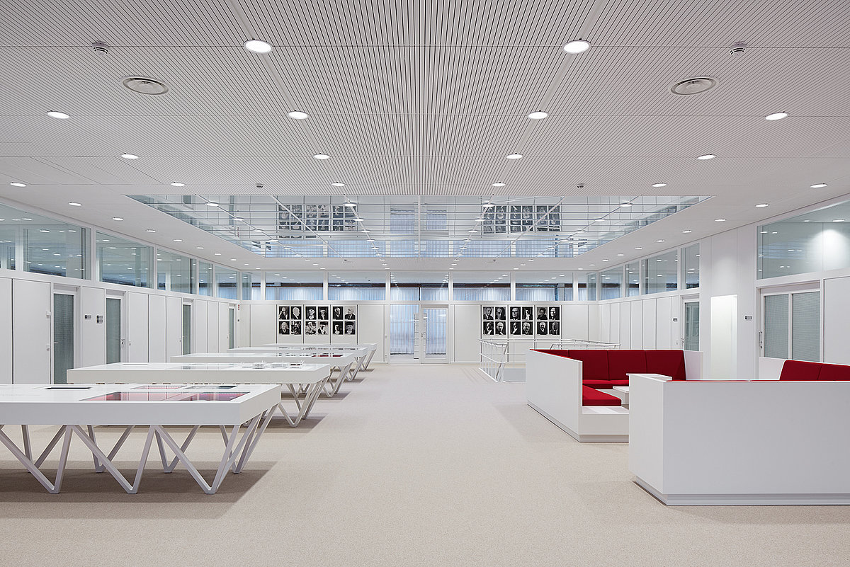 Dank standardisierter Durchmesser passen auch die aktuellen LED-Downlights ohne Mehraufwand in die vorhandenen Deckenausschnitte, in diesem Fall in die Rekonstruktion des damaligen Deckensystems.