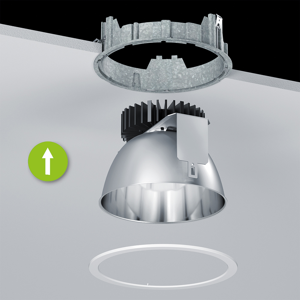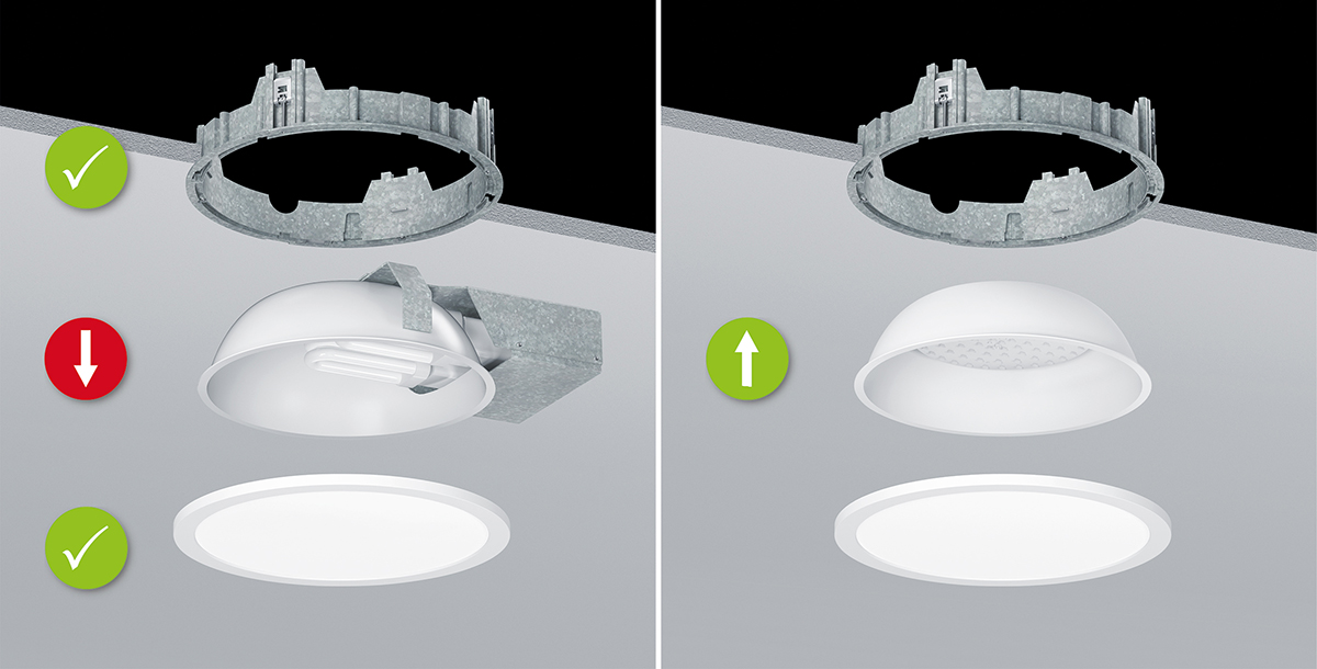 Der vorhande Montage- und Abdeckring wird erneut verwendet und nur der Leuchteneinsatz wird auf LED umgestellt.