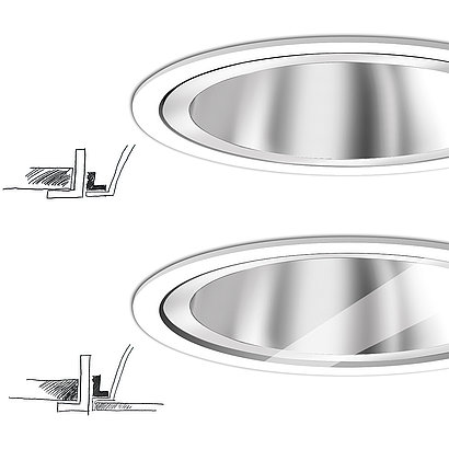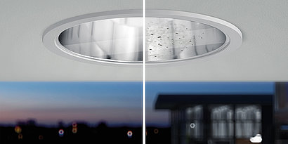 Durch die Verwendung einer Schutzscheibe oder Streuscheibe kann die Schutzart der Leuchte auf IP44 von unten in geschlossenen Deckensystemen aufgewertet werden.