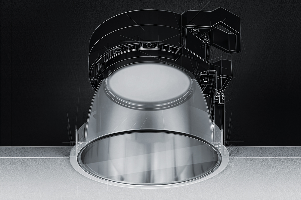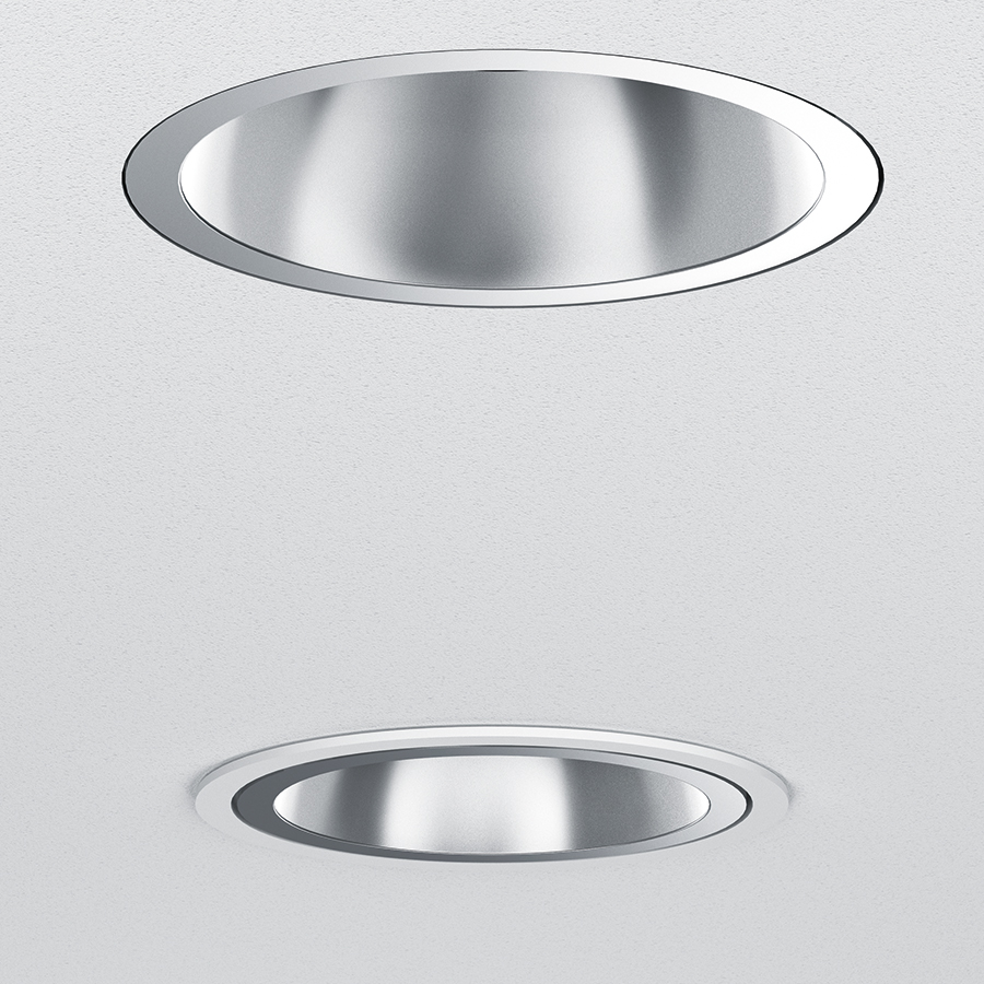 Das neue f3-Montagesystem ermöglicht die unauffällige Deckenintegration durch nur 2 mm Aufbauhöhe, wobei Reflektor und Montagering bündig abschließen.