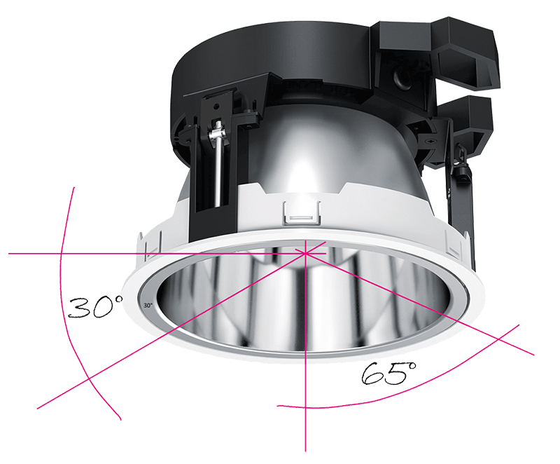Die Downlights erfüllen mit UGR < 19, einem Abschirmwinkel α > 30° / γ 65° < 1000 cd/m² die höchste Güteklasse der Entblendung gemäß EN12464-1 und sind somit für alle Bildschirmanwendungen einsetzbar. Dies ist ideal, wenn die Bildschirmqualitäten erst zu einem späteren Zeitpunkt feststehen.