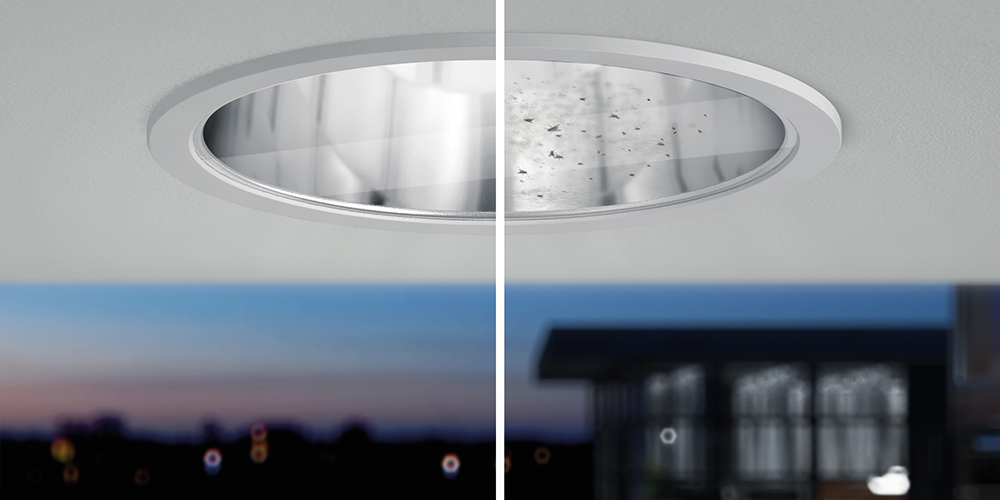 SCHUTZKLASSE IP54 und INSEKTENDICHT - aufgrund des abgekapselten Reflektorraumes und des lichtdichten Gehäuses liegen keine Insekten auf dem unteren Abschlussglas, dies garantiert eine KONSTANTE LICHTVERTEILUNG bei gleichbleibenden Wirkungsgraden, REDUZIERT die WARTUNG und sorgt für ein SAUBERES DECKENBILD.