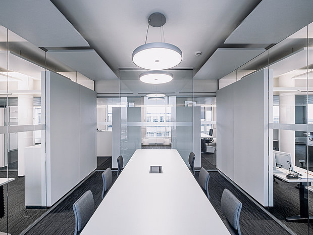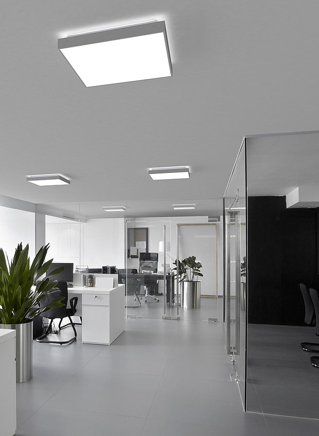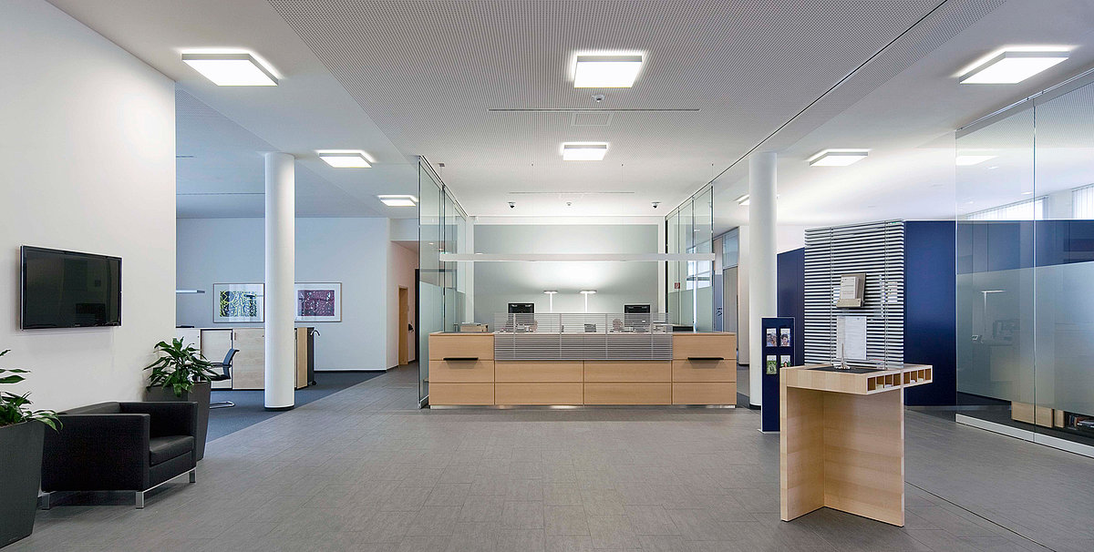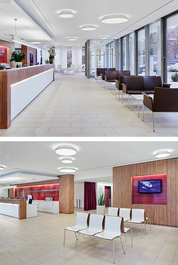 Für einen lebendigen Raumeindruck sorgen CLEAR Deckenleuchten, die mit ihrer direkten/indirekten Lichtverteilung die großzügige Empfangshalle illuminieren. Der MIX aus DIREKTEN und INDIREKTEN LICHTANTEILEN sorgt zusätzlich für eine Akzentuierung der Decke oder Wand, wodurch der Raum optisch an Größe gewinnt.