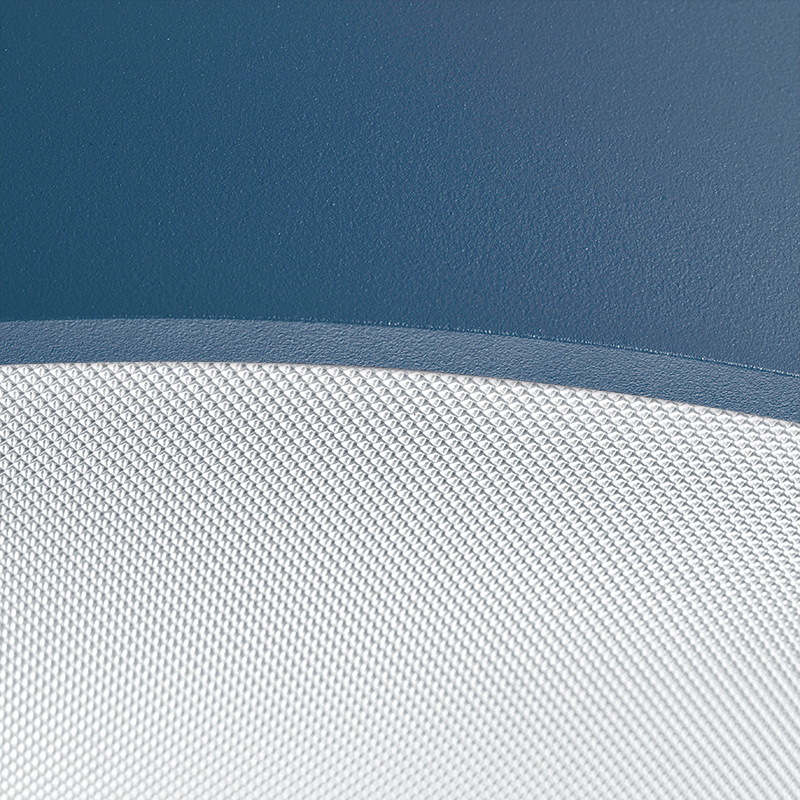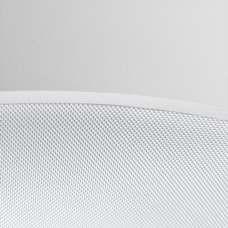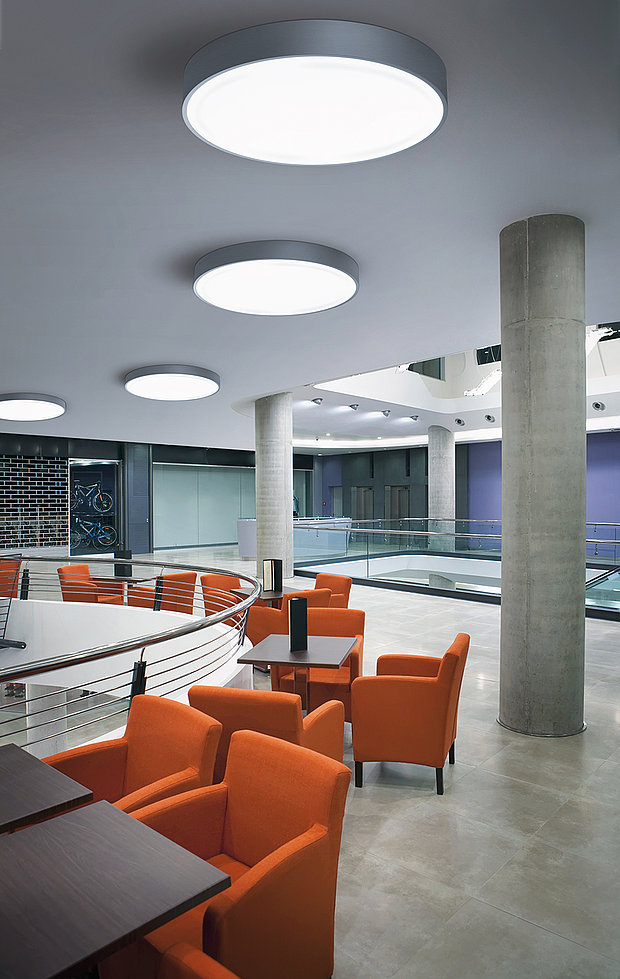 Die Flure, Treppenhäuser und Relax-Zonen verfügen über einen Mix von großdimensionierten CLEAR DIRECT Anbauleuchten in einer speziellen Halbeinbauversion, die Neigung der Leuchten um 4° sorgt zusätzlich für spannende Aspekte in der Gestaltung. Die formale Reduktion und dezente Materialität aus Aluminium und weißem Acryl prädestinierte die Familie CLEAR als Ausgangspunkt der architektonischen Deckengestaltung.