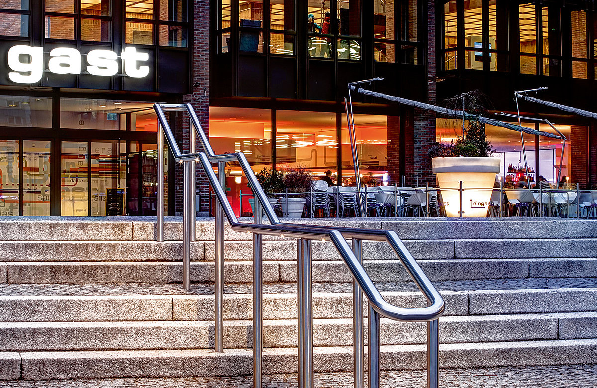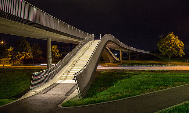 Bei den zahlreichen Treppenaufgängen überzeugt das speziell für den bündigen Einbau in metallene Handlaufprofile entwickelte LED PUCK System für eine sicherheitsrelevante Ausleuchtung der Stufen. Außerdem erhellen die kleinen, effizienten Leuchtmittel (1,6 W), die eine Lebensdauer von etwa 50.000 Stunden haben, mit dem Warmton 3.000 Kelvin atmosphärisch das angrenzende Mauerwerk.