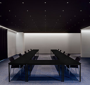 Die Hauptaufgabe ist die Ausleuchtung des Raumes. Dies kann je nach Funktion des Raumes sehr gleichmäßig mit breitstrahlenden Floods oder mit höherer Theatralik durch engstrahlende Spots erfolgen. Konferenzräume erfodern gleichmäßiges, gut entblendetes Licht, die schwarzen Downlights bieten zudem eine perfekte Integration in die Architektur.