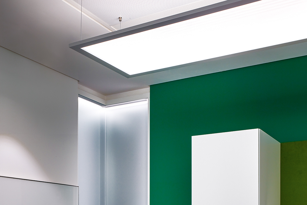 Die TRANSPARENZ des MATERIALS erlaubt eine Architektur des Lichts und der Transparenz. Dadurch, dass die Leuchte die Architektursprache nicht überlagert, behalten Räume ihre ursprünglich geplante Eigenständigkeit. Im eingeschalteten Zustand kann der Raum bewusst neu interpretiert werden.