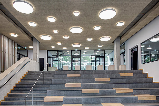 Der Eingangsbereich der Sophie-Barat-Schule öffnet sich in ein großzügiges Atrium, das sich mit Sitzstufen aus Sichtbeton über zwei Geschosse erstreckt und den Blick durch eine gläserne Front auf den Schulhof freigibt.