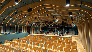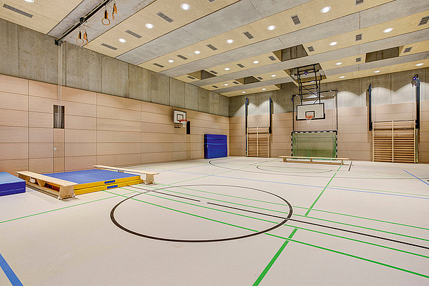 In der im Untergeschoss befindlichen 410 m² großen Sporthalle kommen speziell entwickelte ballwurfgeschützte TENTEC Downlights zum Einsatz. Dank der guten Ausleuchtung ist der Ball immer perfekt zu sehen; und durch die verschraubte Schutzscheibe aus dickwandigem PMMA die LED perfekt geschützt.