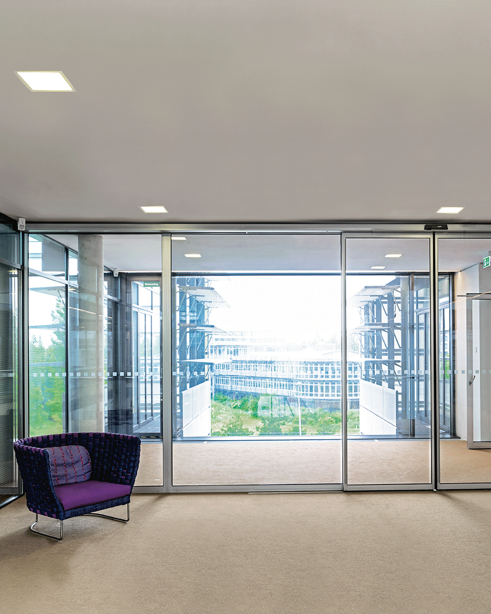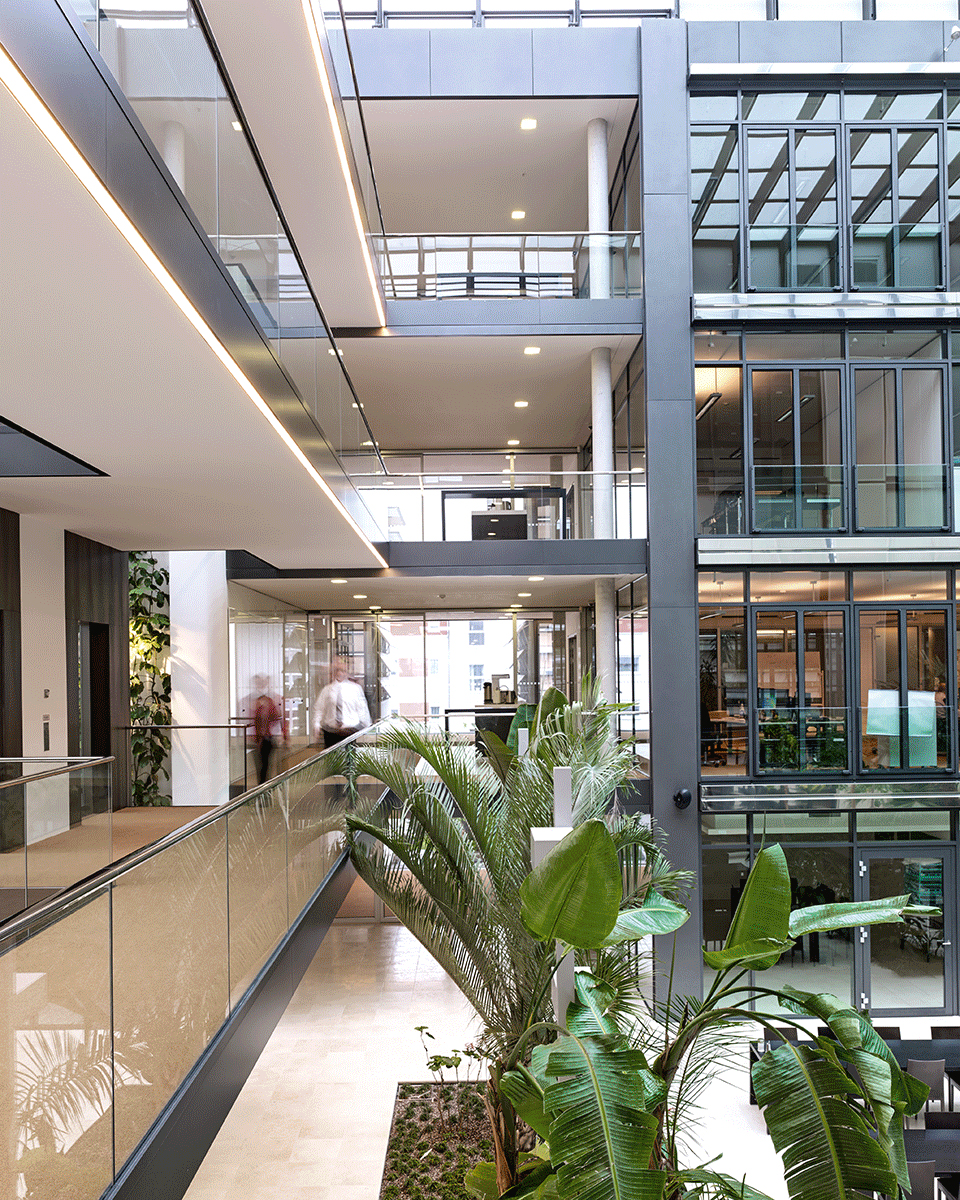 Unterschiedlich große CLEAR Deckenleuchten mit einem Mix aus direkten und indirekten Lichtanteilen setzen spannende Akzente und leuchten das Atrium homogen aus.
