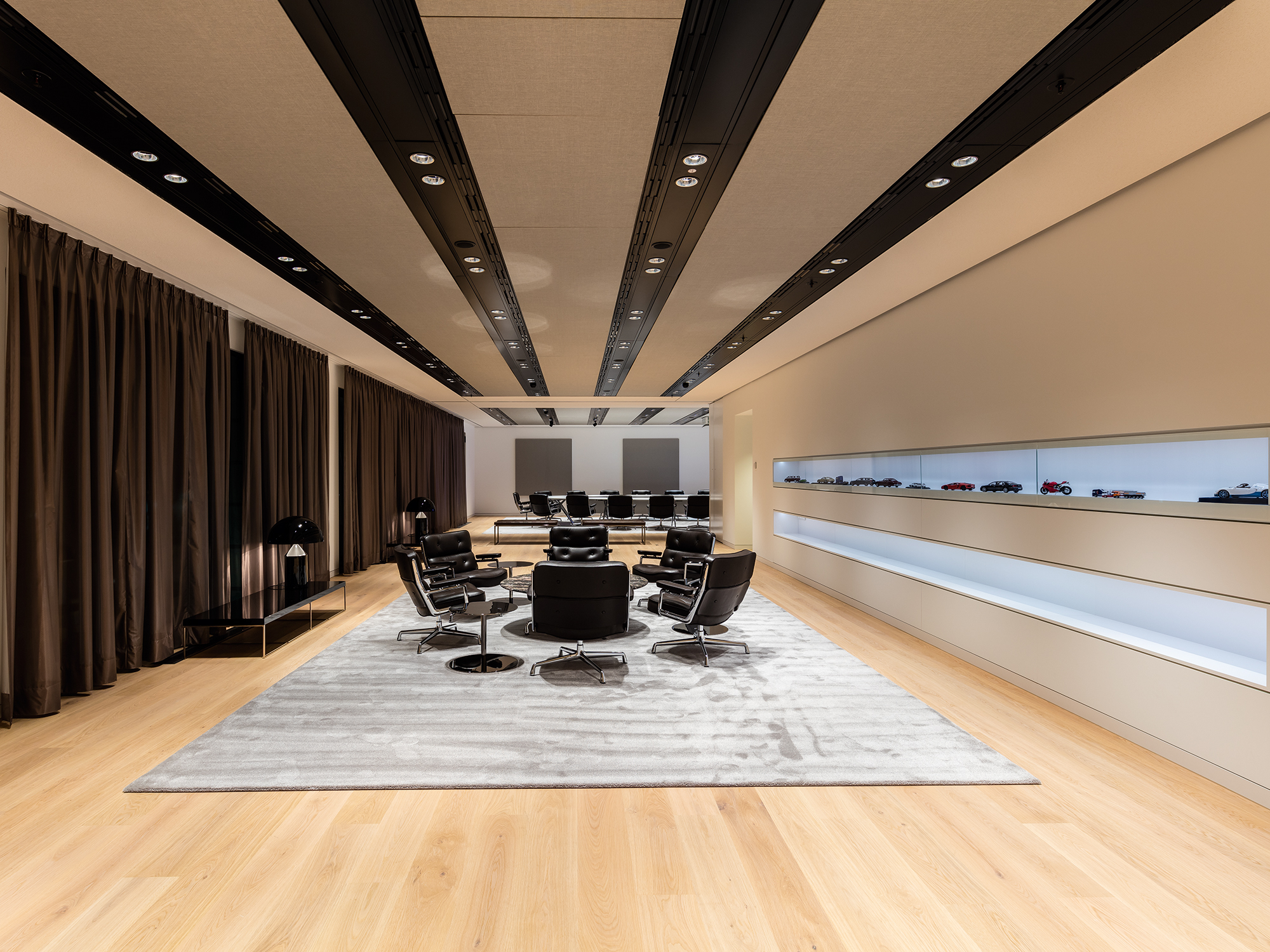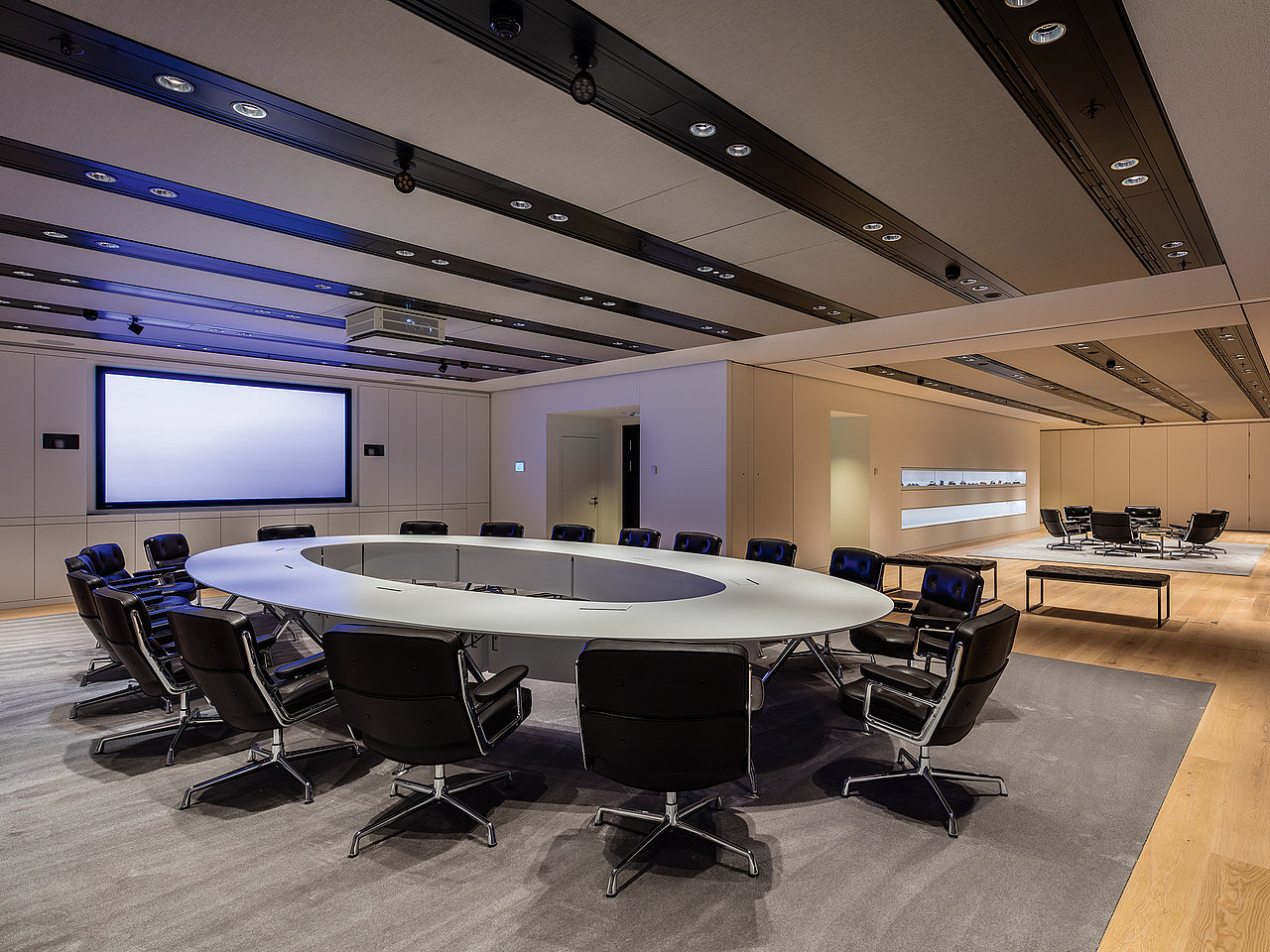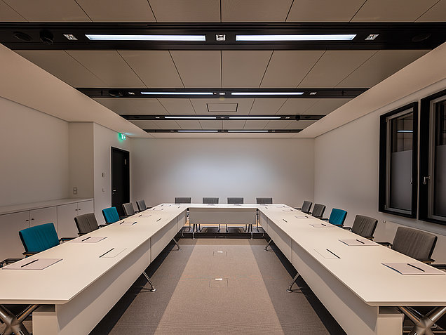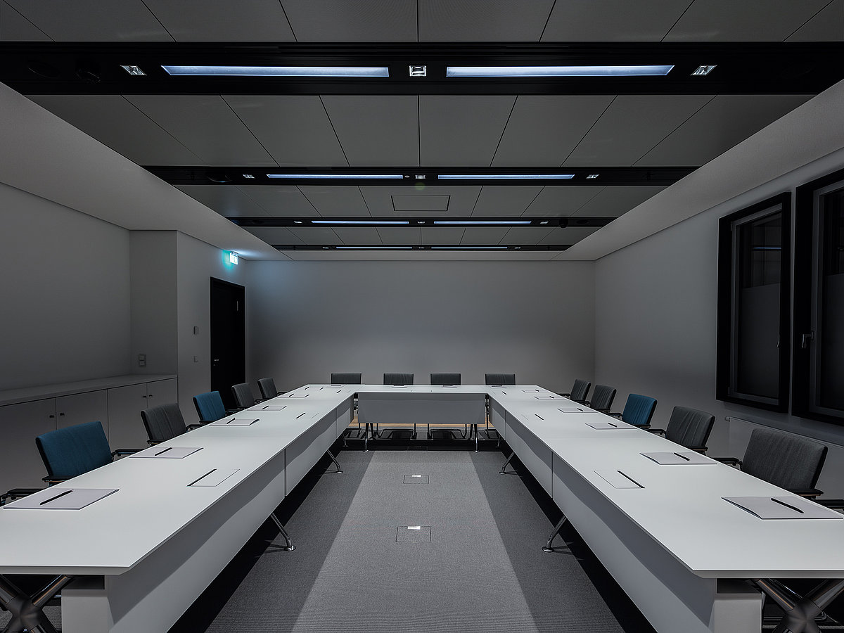 Für Tagungen, Konferenzen und Besprechungen stehen diverse Räumlichkeiten mit modernster Technik zur Verfügung. Damit die Beleuchtung optimal an die jeweilige Vortragssituation angepasst werden kann, ist die Lichtfarbe und Beleuchtungsintensität separat einstellbar. Die ALPHABET SPECTRA Downlights mit 20 W in der Ausführung WarmDim wechseln beim stufenlosen Dimmvorgang von 3000 K bis zu 1800 K. Die linearen Leuchten können zusätzlich vom warmen Licht mit 3000 K auf kühles Licht mit 4000 K umgeschaltet werden. Eine Vielzahl unterschiedlicher Lichtszenen ist so über die DALI-Steuerung realisierbar. Beide Leuchtengruppen sind im multifunktionalen Lichtkanal integriert, aus diesem Grund wurden die linearen Leuchten projektspezifisch an die Leuchtenbreite der quadratischen Downlights von 100 mm angepasst.