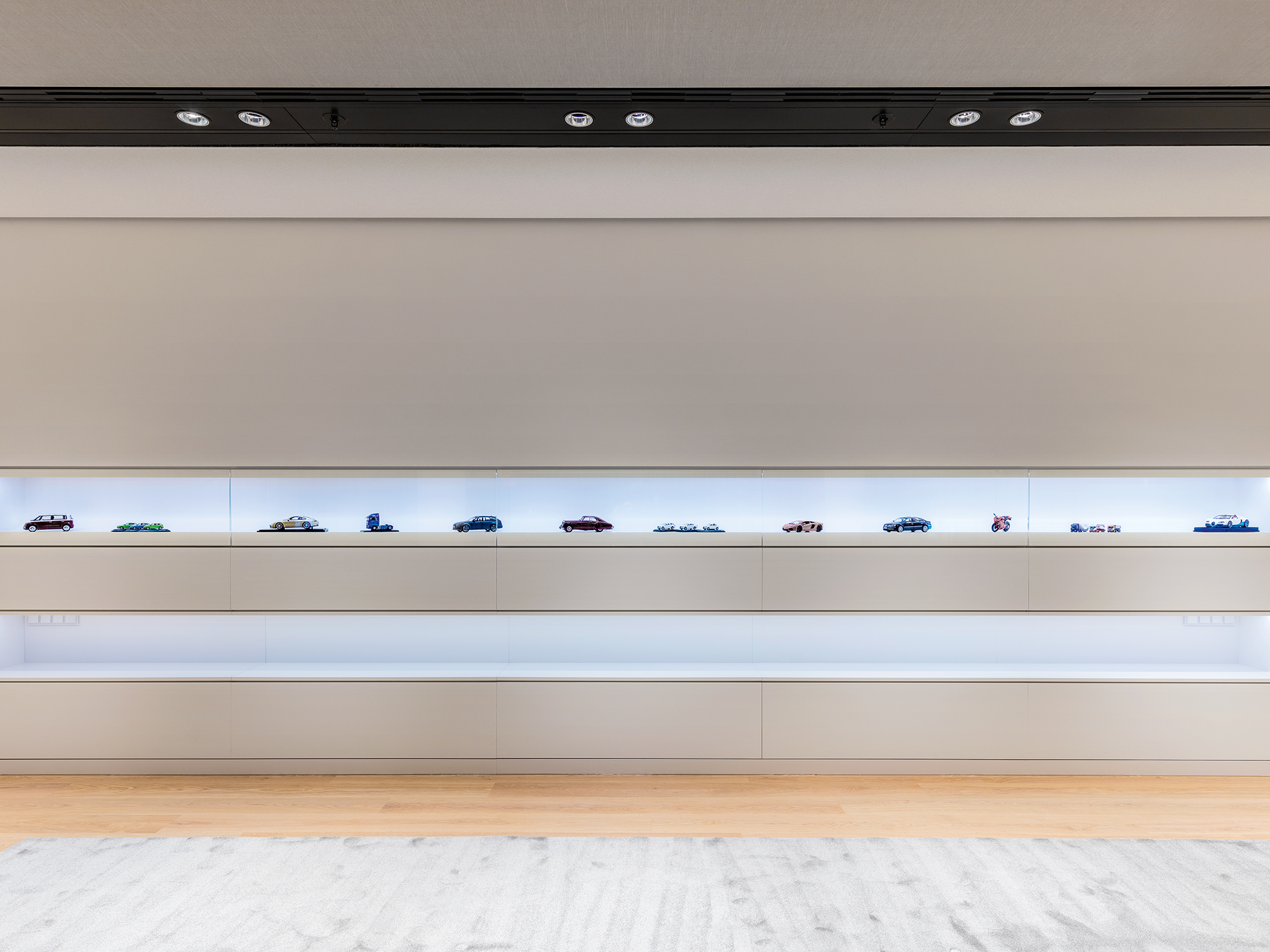 Der Haupteingang zum Gebäude liegt unter den Arkaden. Im Innern öffnet sich dem Besucher sofort der imposante 7,6 Meter hohe Ausstellungsraum mit den Hauptachsen und den beiden oberen Galerien. Eine lichttechnische und architektonische Herausforderung ist die visuelle Lenkung des Besuchers zum Empfang auf seiner Rechten die mittels WILA Downlights für eine harmonische Grundbeleuchtung gelöst wurde. Runde Lichtdecken in unterschiedlichen Durchmessern bis maximal 4,6 m erzeugen eine Raumatmosphäre vergleichbar mit dem Tageslicht. Der auch in den anderen Gebäudebereichen eingesetzte Lichtkanal kommt hier in radialer Ausführung zum Einsatz. In dem umlaufenden Kanal sind runde WILA LED Downlights aus der Produktfamilie ALPHABET SPECTRA mit 28 W in 3000 K und einer exzellenten Farbwiedergabe von Ra > 95 eingesetzt. Unterschiedliche Lichtszenen für unterschiedliche Lichtstimmungen können individuell abgerufen werden.