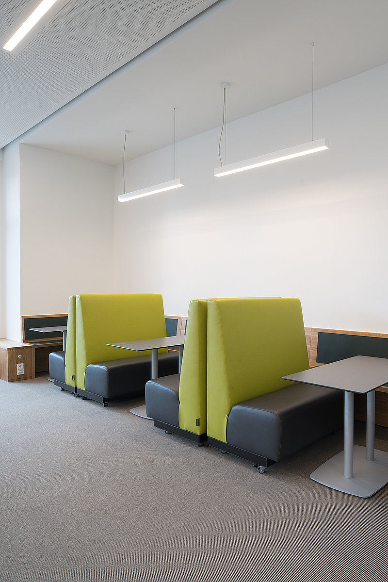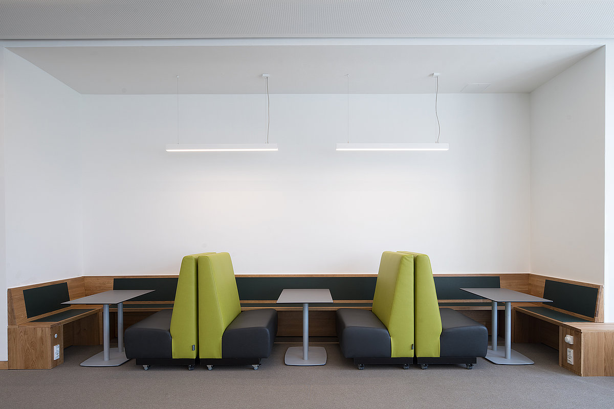 Neben Einzel- und Gruppenarbeitsplätzen, die sich durch das bewegliche Mobiliar den Bedürfnissen der Studierenden anpassen, befinden sich Relaxzonen mit Loungemöbeln, sehr beliebt sind auch die Sitzmöglichkeiten am „Schaufenster“.