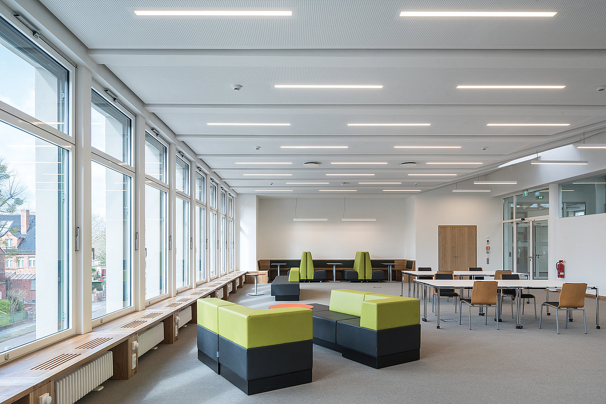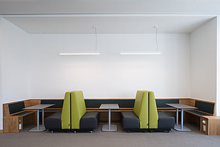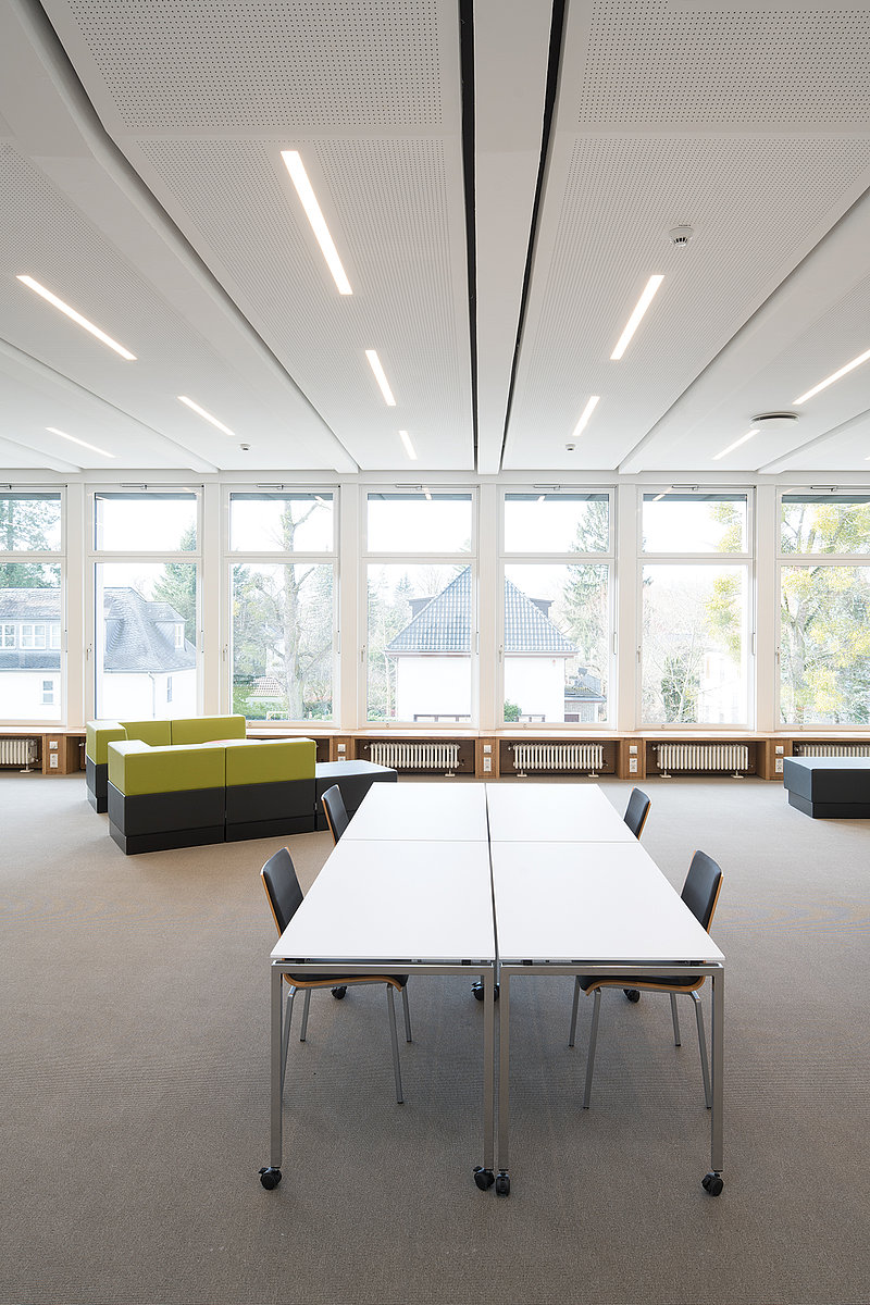 Licht spielte bei der Modernisierung des ehemals “stillen Lesesaals” der Freien Universität Berlin eine große Rolle, die Glasfront ermöglicht die großzügige Nutzung des Tageslichts. Zusätzlich kommen STRONG 40 Einbau- und Pendelleuchten zum Einsatz. So kann das richtige Licht zu jeder Zeit in jedem Teil der neuen Coworking-Zone eine angenehme und motivierende Raumatmosphäre schaffen.